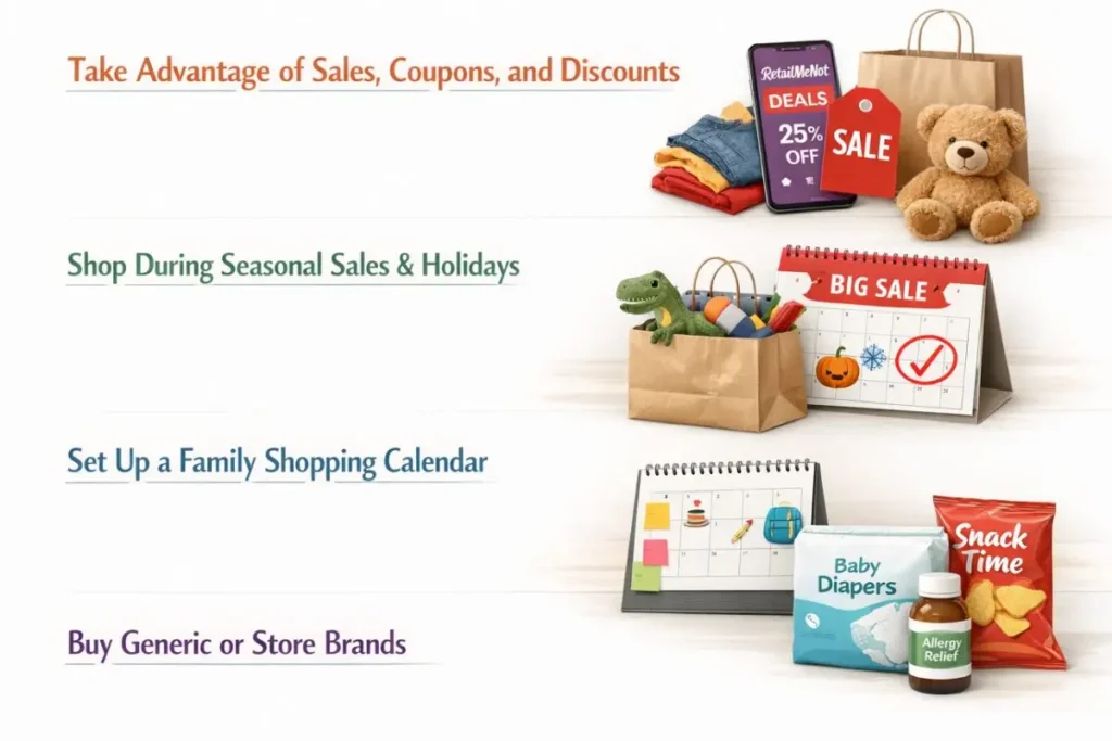 • Store-brand items, like diapers, snacks, and medications, are often just as good as name-brand versions but cost less.